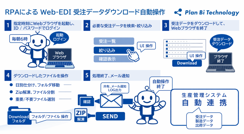 - 代表例)Web-EDI受注データの操作・・・毎日定刻に自動実行